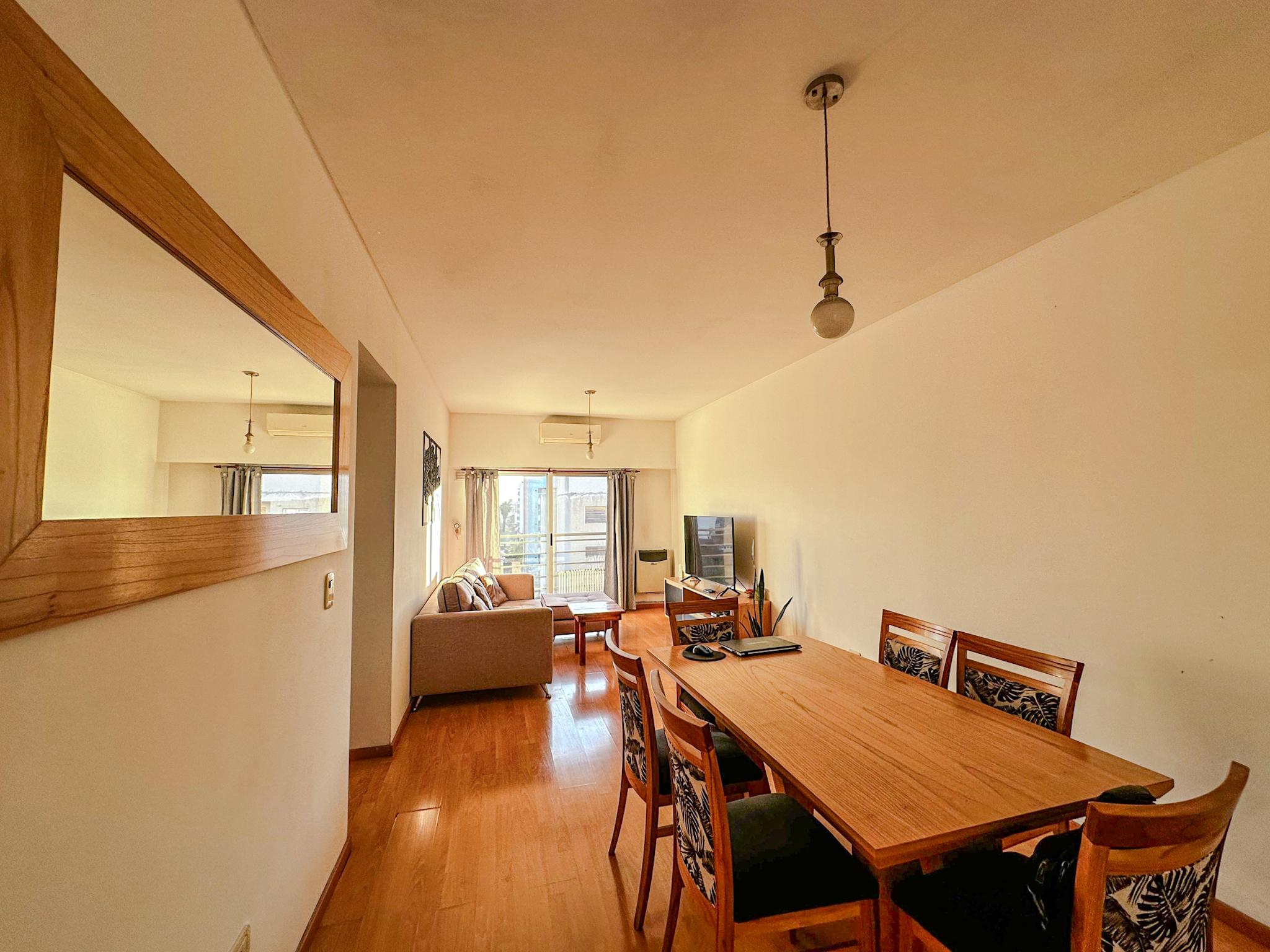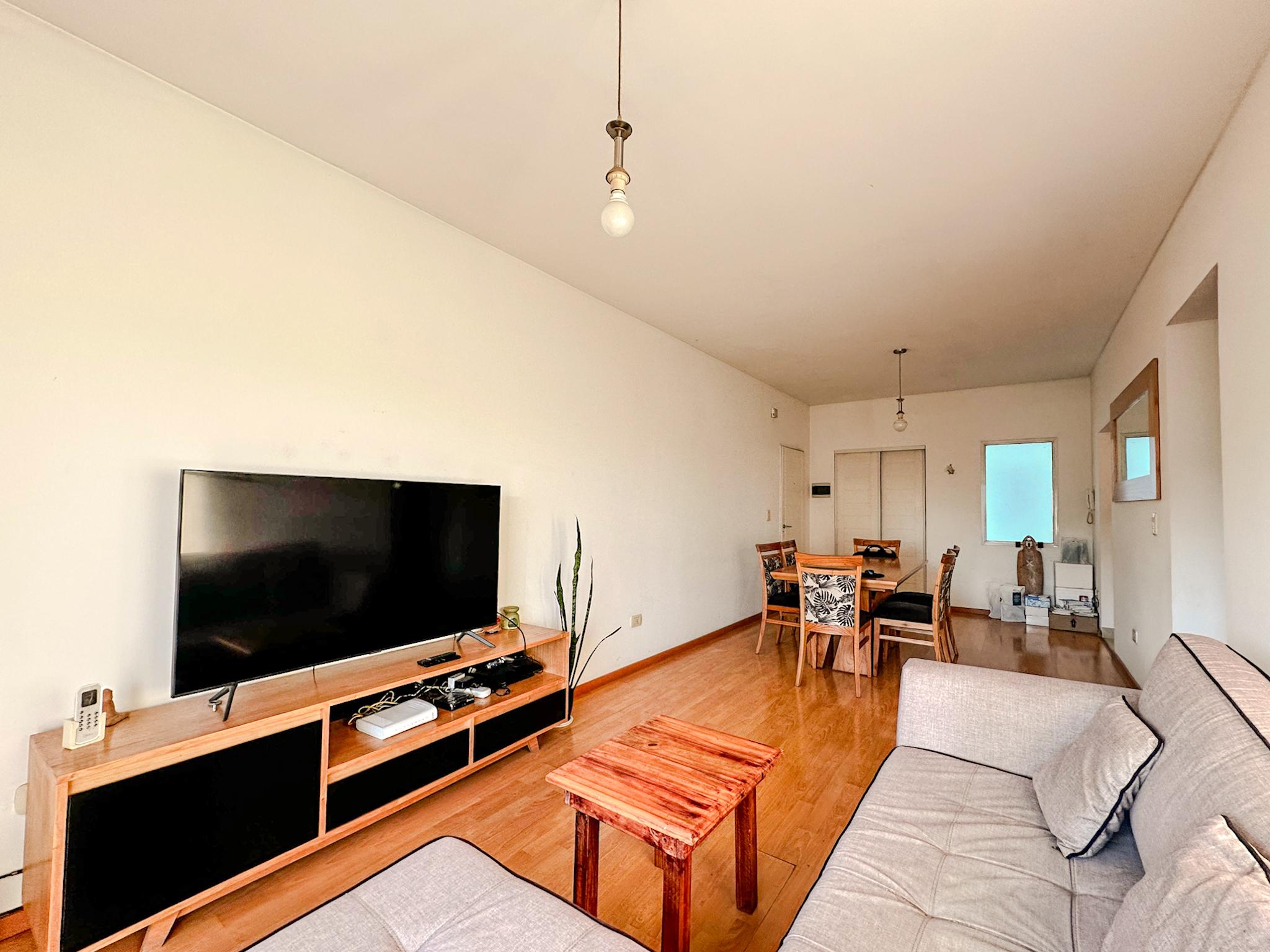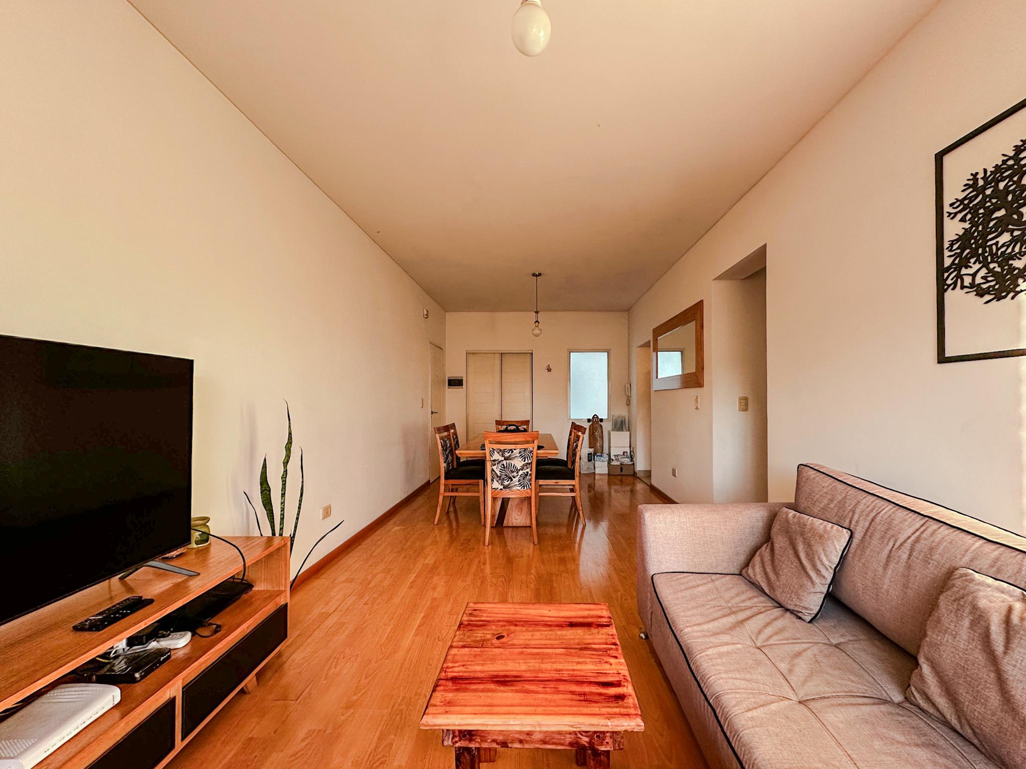 El departamento cuenta con living comedor, balcón, cocina muy amplia con espacio para desayunador, lavadero, baño completo, toilette, dos habitaciones, y cochera cubierta. Todo en excelente estado de conservación.